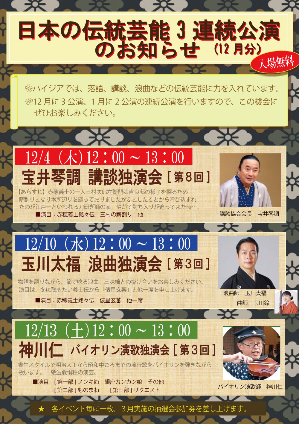 日本の伝統芸能3連続公演のお知らせ(12月分)
