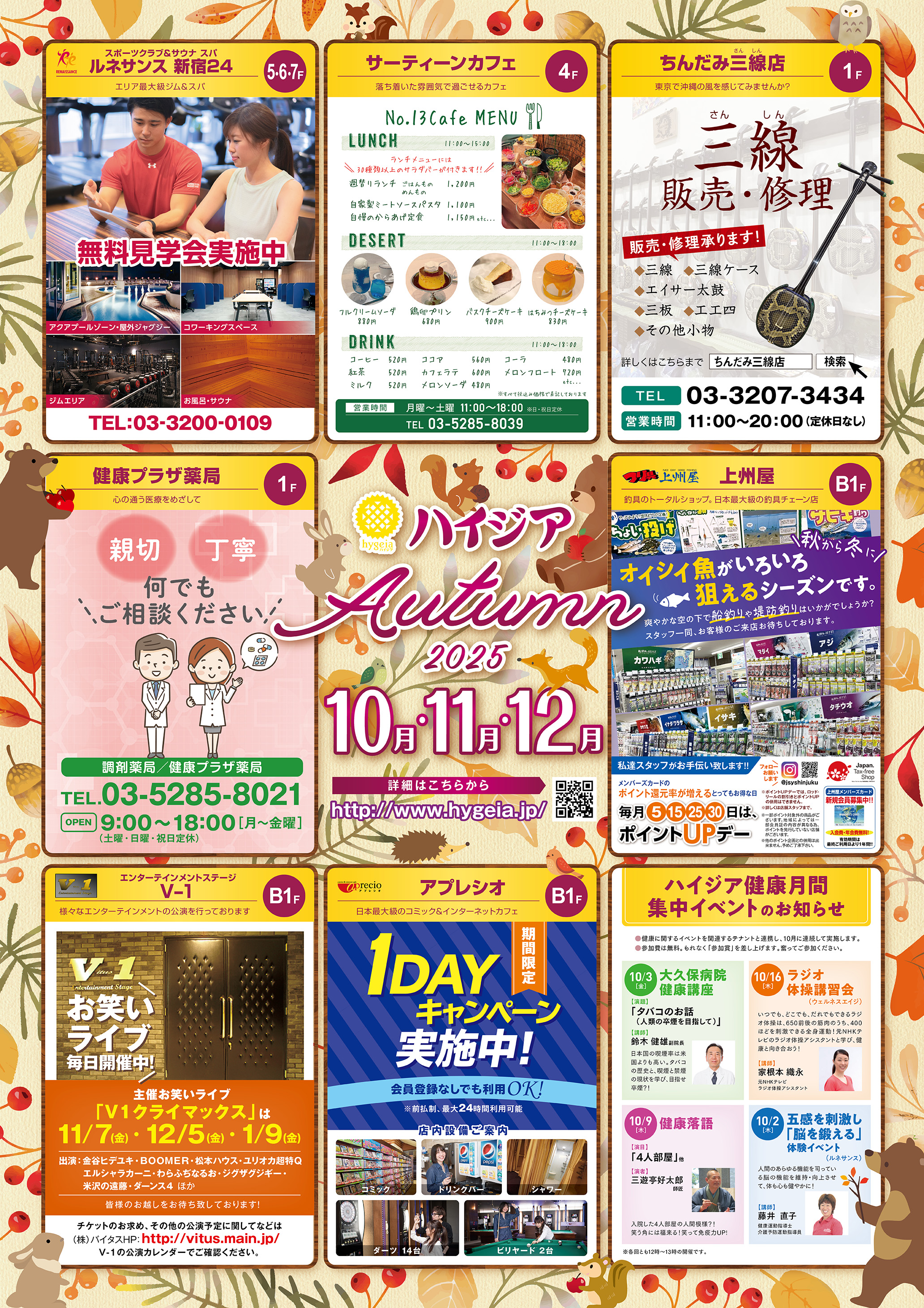 見取り図 見取り図 1F B1F 公共系テナント business公共系テナント 東京都立大久保病院 03-5273-7711 施設棟1階・2階、病院棟 business公共系テナント TOKYOチャレンジネット 03-5155-9501 施設棟3階・9階 business公共系テナント 東京都保健医療情報センター(ひまわり) 03-5272-0303 施設棟3階 business公共系テナント 東京都福祉保健財団(ウェルネスエイジ) 03-5285-8000 施設棟3階・4階 business公共系テナント 東京都公園協会 03-3232-3011 施設棟9階・10階 business公共系テナント しんじゅく多文化共生プラザ 03-5291-5171 施設棟11階 business公共系テナント きみまも@歌舞伎町 03-6709-6651 施設棟17階 商業系テナント shopping_cart商業系テナント つり具 上州屋 03-5285-8451 施設棟地下1階 shopping_cart商業系テナント ネットカフェアプレシオ 03-3205-7336 施設棟地下1階 shopping_cart商業系テナント エンターテインメントステージV-1 03-6273-8901 施設棟地下1階 shopping_cart商業系テナント 調剤薬局健康プラザ薬局 03-5285-8021 施設棟1階 shopping_cart商業系テナント ちんだみ三線店 03-3207-3434 施設棟1階 shopping_cart商業系テナント サーティーンカフェ 03-5285-8039 施設棟4階 shopping_cart商業系テナント スポーツクラブ&サウナスパ ルネサンス新宿24 03-3200-0109 施設棟5階・6階・7階 館内ポスター 館内ポスター秋号のショップ情報をお知らせします。 お得な情報満載なので是非ご覧下さい。 PDFを見る