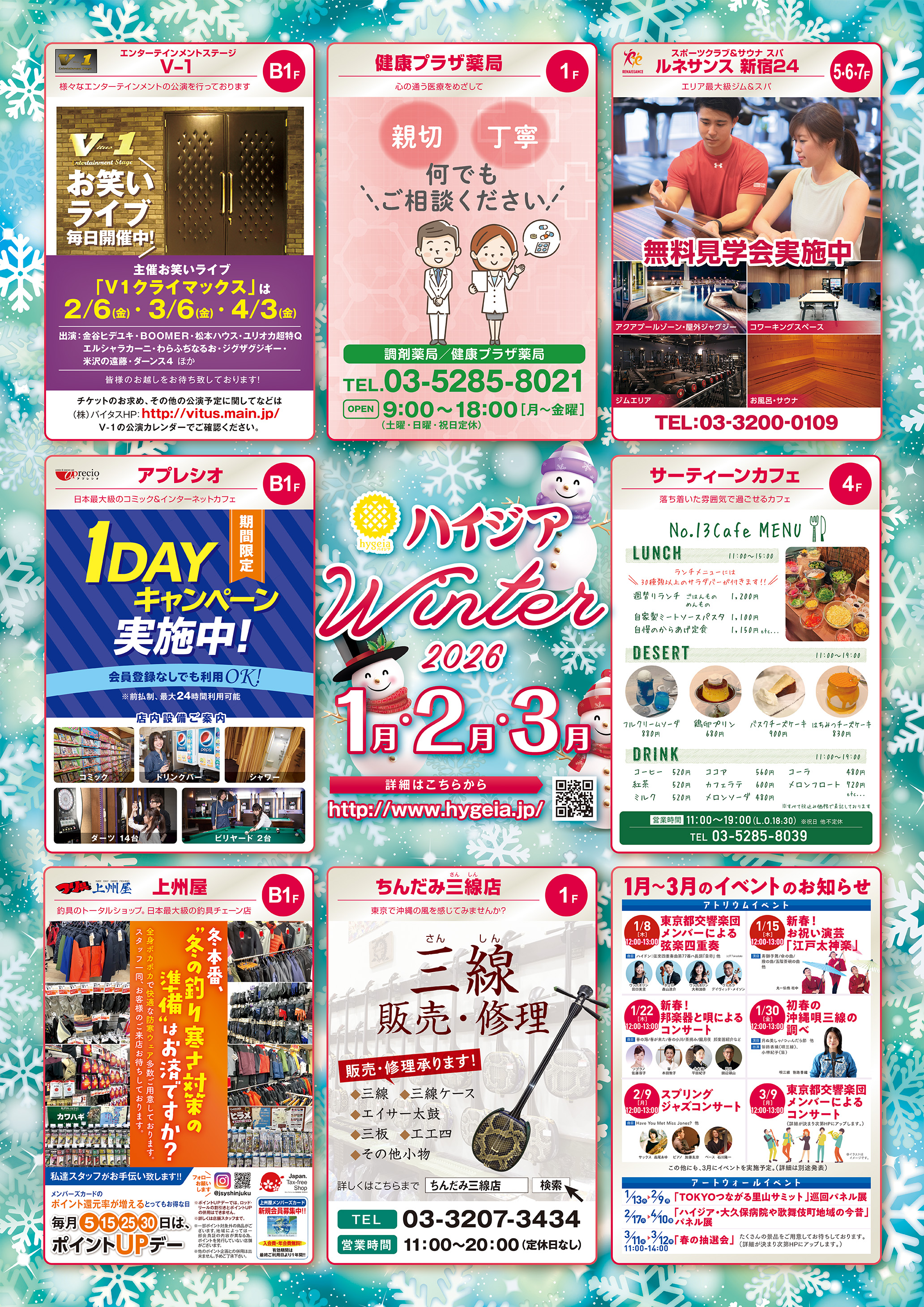 見取り図 見取り図 1F B1F 公共系テナント business公共系テナント 東京都立大久保病院 03-5273-7711 施設棟1階・2階、病院棟 business公共系テナント TOKYOチャレンジネット 03-5155-9501 施設棟3階・9階 business公共系テナント 東京都保健医療情報センター(ひまわり) 03-5272-0303 施設棟3階 business公共系テナント 東京都福祉保健財団(ウェルネスエイジ) 03-5285-8000 施設棟3階・4階 business公共系テナント 東京都公園協会 03-3232-3011 施設棟9階・10階 business公共系テナント しんじゅく多文化共生プラザ 03-5291-5171 施設棟11階 business公共系テナント きみまも@歌舞伎町 03-6709-6651 施設棟17階 商業系テナント shopping_cart商業系テナント つり具 上州屋 03-5285-8451 施設棟地下1階 shopping_cart商業系テナント ネットカフェアプレシオ 03-3205-7336 施設棟地下1階 shopping_cart商業系テナント エンターテインメントステージV-1 03-6273-8901 施設棟地下1階 shopping_cart商業系テナント 調剤薬局健康プラザ薬局 03-5285-8021 施設棟1階 shopping_cart商業系テナント ちんだみ三線店 03-3207-3434 施設棟1階 shopping_cart商業系テナント サーティーンカフェ 03-5285-8039 施設棟4階 shopping_cart商業系テナント スポーツクラブ&サウナスパ ルネサンス新宿24 03-3200-0109 施設棟5階・6階・7階 館内ポスター 館内ポスター冬号のショップ情報をお知らせします。 お得な情報満載なので是非ご覧下さい。